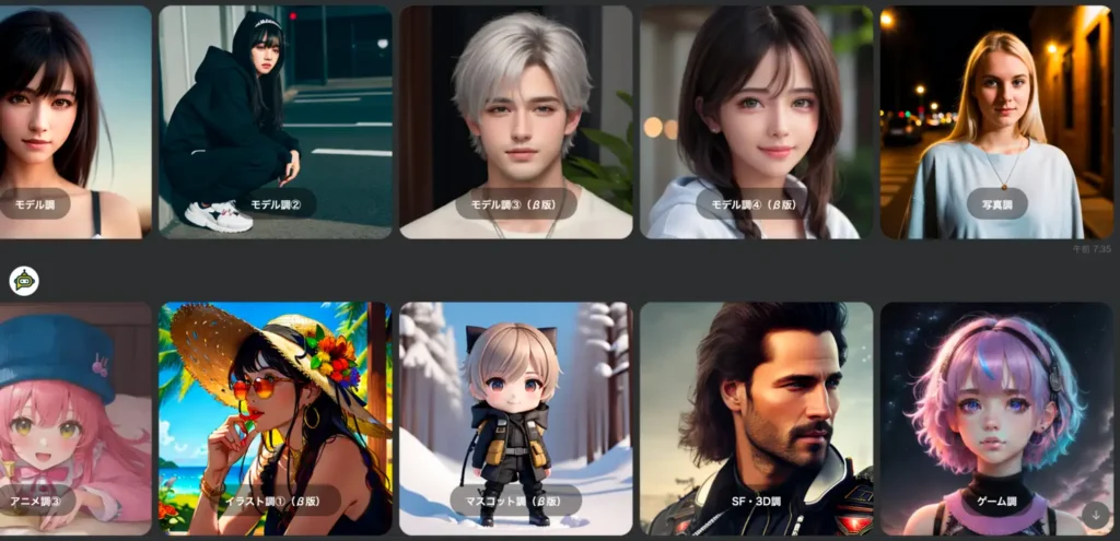 Stable Diffusionによる画像生成では、簡単な日本語のメッセージを送るだけで、高品質な画像を生成できます。本家Stable Diffusionのように複雑なプロンプトや英語は不要。「黒髪、女性、可愛い、カフェ、コーヒー、椅子に座ってる」のような自然な日本語で、イメージ通りの画像が完成します。画像タイプは13種類以上用意されており、モデル調、写真調、アニメ調、イラスト調、マスコット調、SF/3D調、ゲーム調など、好みのスタイルを選択できます。