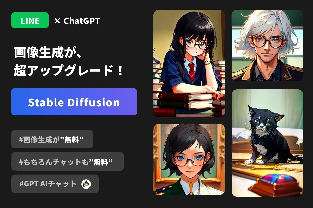 ChatGPTとStable Diffusionによる画像生成を、LINEひとつで手軽に利用できるサービスです。複雑な操作や英語のプロンプトは不要。日本語のメッセージを送るだけで、高品質な画像生成とAI対話が楽しめます。